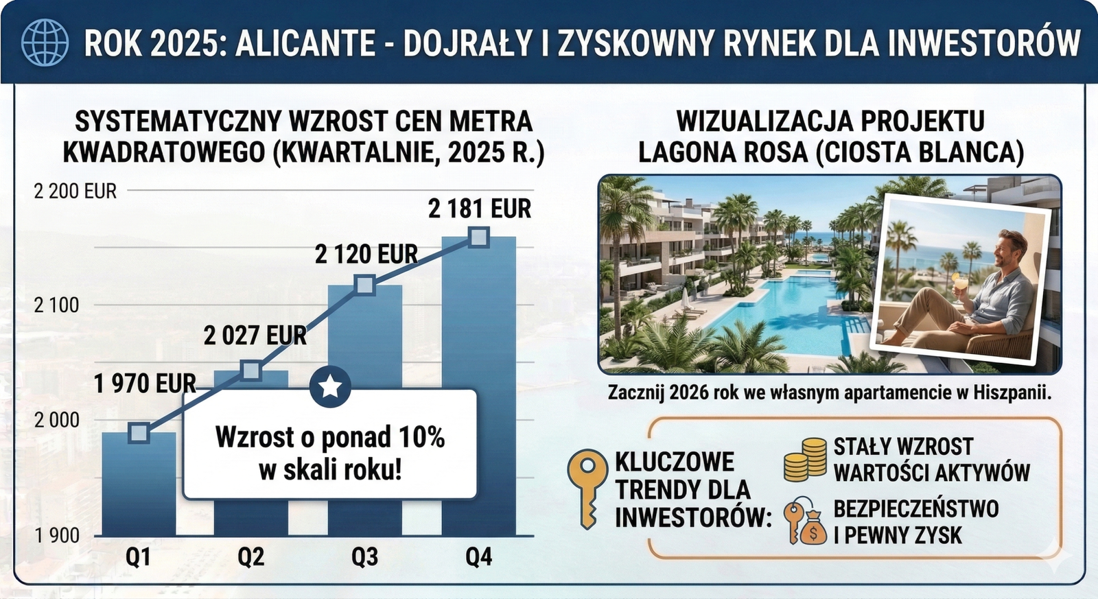 Dla Polaków, którzy w 2025 roku licznie ruszyli na zakupy, była to doskonała decyzja. Rosnące ceny metra kwadratowego (z 1 970 EUR do 2 181 EUR w ciągu roku) są najlepszym dowodem na to, że Costa Blanca to nie tylko miejsce na wakacje, ale przede wszystkim twarda waluta i zyskowna lokata kapitału. Jeśli myślisz o inwestycji, trendy z 2025 roku są najlepszą rekomendacją na przyszłość.