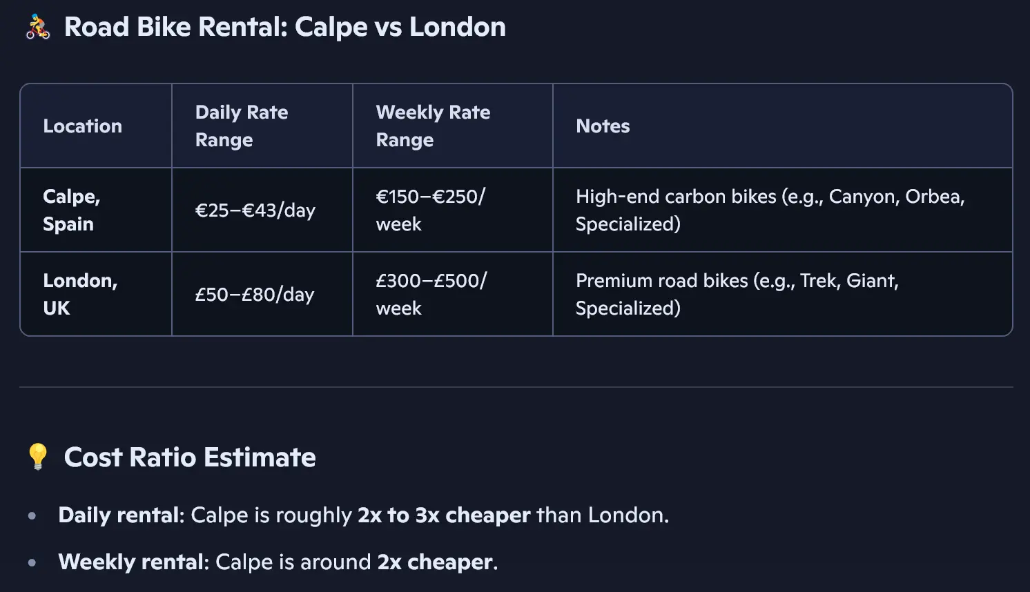 The only limiting factors are your legs and your budget. But considering that bike rentals in Calpe are, on average, 2 to 3 times cheaper than in London, your budget will stretch a lot further. Time to focus on your legs!