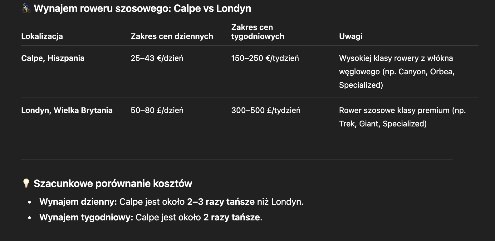Za dodatkową opłatą często można wypożyczyć model z wyższą grupą osprzętu (jak Shimano Ultegra lub Dura-Ace) i lżejszą ramą. To idealna okazja, by przetestować ten sam sprzęt, którego używają zawodowcy.